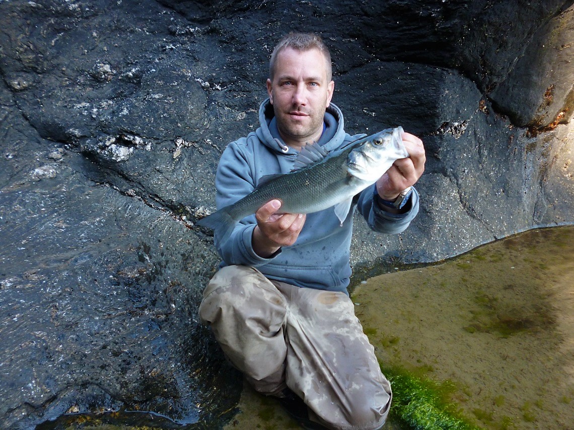 The tiny (10 yards across) secluded cove that we’d rounded earlier was full of rotten weed (maggots/sandhoppers/lice etc.) that was being disturbed by the building spring tide and waves… To me that spelt two things – mullet and bass! So there I am, crawling along a ledge a couple of feet above the water, but only 2 metres out from the dry shingle when I spot them – 2 bass, both in the 3 lb range – nowhere near as large as the ones I’d spotted nearby a few days previously but nice bass all the same. The trick was to try and catch one!