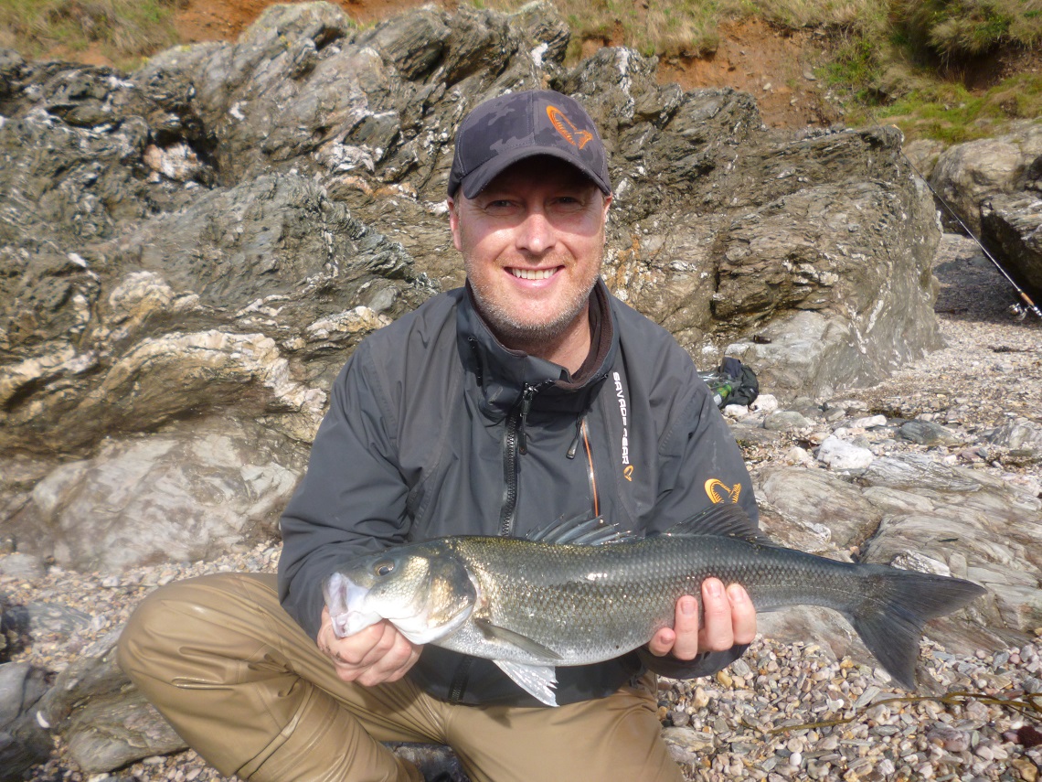 One of the lures that I’d been using/testing is the new and competitively priced Savage Gear Jerk Minnow 145 SF. Weighing 14g and measuring 145mm they cast well and are extremely sandeel-like when retrieved on a medium-fast retrieve and/or twitched intermittently. And it was this very lure, in the Blue Sardine colour that attracted the dark backed brute of a bass below (measuring 58cm/around 4¾lb) just as the lure was brought over a weed-bed, at the tip of a rock formation running parallel to my stance.