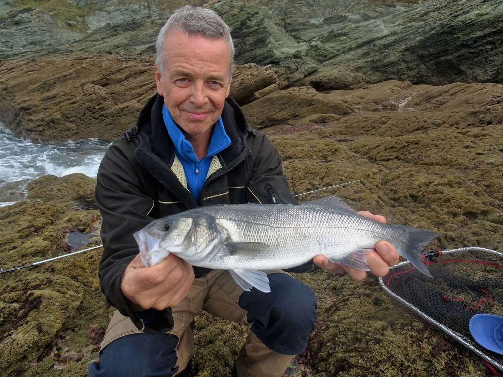 Not a huge bass by any stretch, but one of three that my client (Dave) landed during a short session out on the rocks. Shallower water this time at between 4-10ft such was the velocity of this monster spring tide. There were a number of aspects to this session that were significant though – the poor water clarity due to the thunderous yet extremely intermittent swell (three larger waves then eerily flat) that would rise up and roll in being one of them. Further, I reasoned that the bass would take full advantage of the sudden turmoil by way of almost expecting food items to be washed out of the weed and rocky crevices.