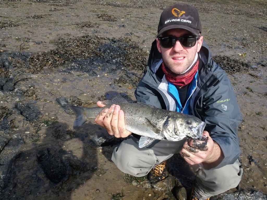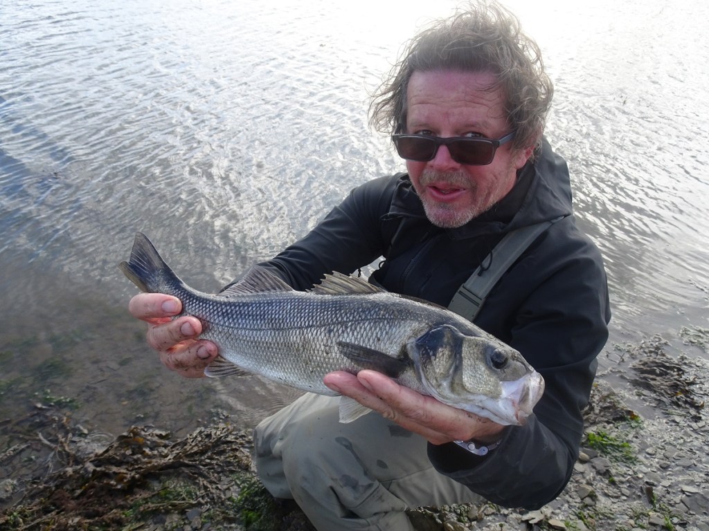 Clearly they’d landed another bass, and with its wellbeing at the forefront of my mind I sprinted, my ruck sack bouncing all over the shop, as I hurriedly ‘splodged’ back over to them both. “Stopping momentarily to catch my breath I shouted to Pete, “how big mate?”, to which he gestured about this big (very big) with his arms! He’s having me on were my immediate thoughts though, as he is a joker is Pete!