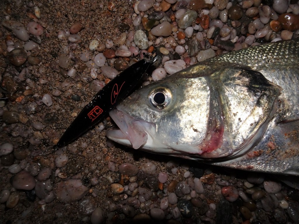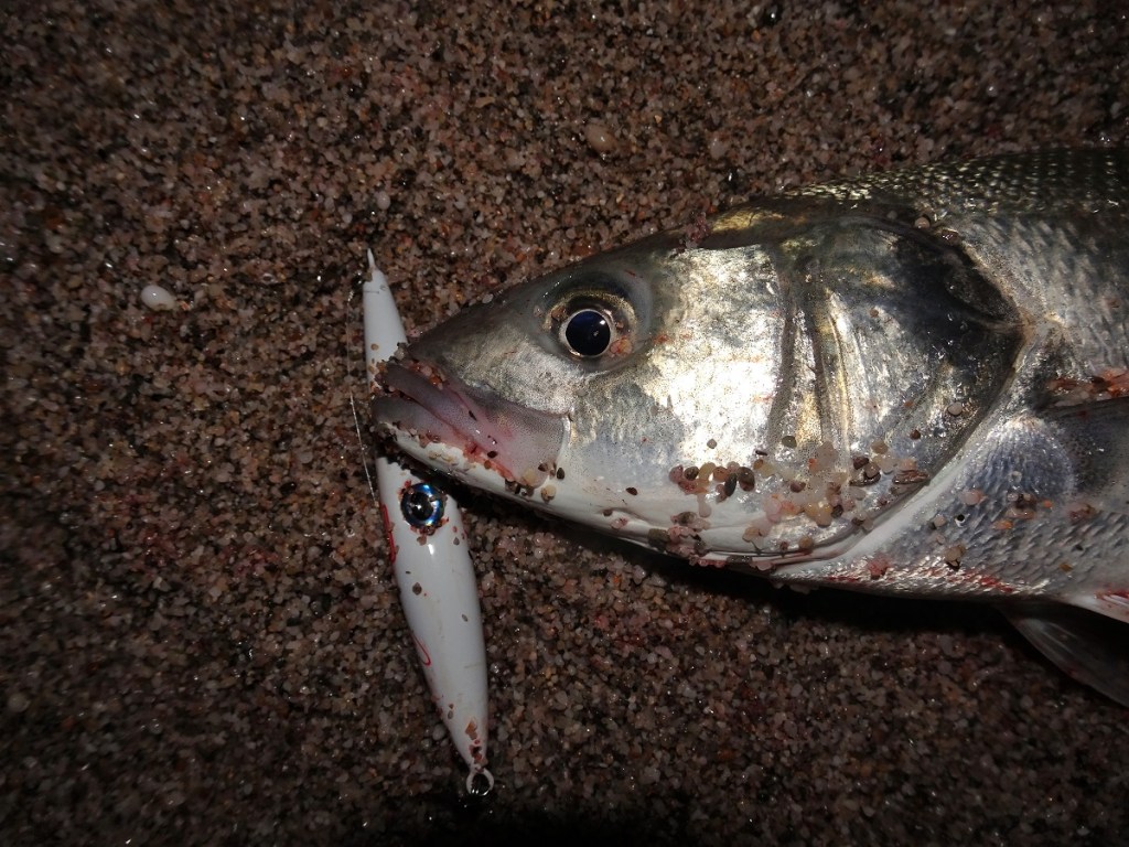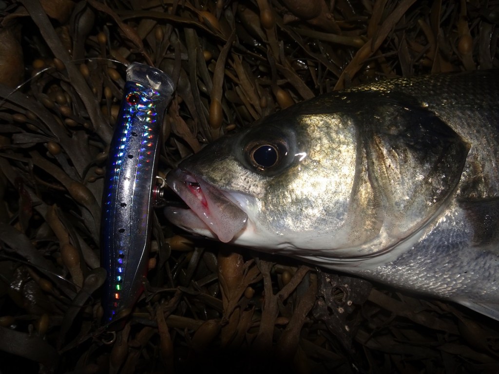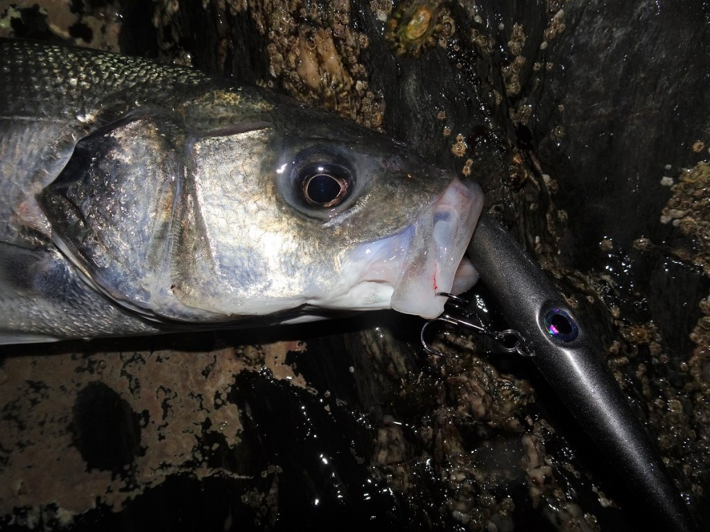 Gradually, as the state of the beaches and the quality of the fishing returned to something resembling normality I welcomed a party of 3 anglers, down for 3 days of intense ‘bass chasing’. It started well too, when Ash (a really top bloke from Sussex) hammered out a bass larger than it looks (he’s got massive hands honest!) on a lure that he really wanted to learn to use (a Needlefish over reefy terrain), followed by another the following night on one of mine.