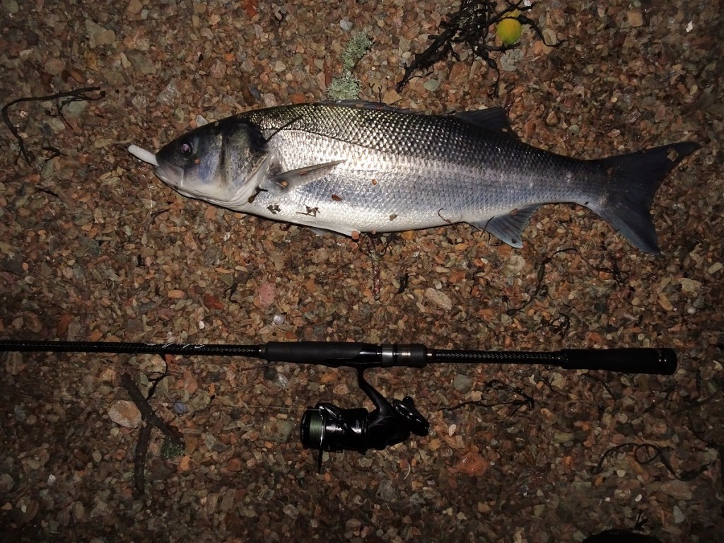 Tightening up as swiftly as I could, I knew the lure would already be on the seabed as I lifted the rod and began the five or so slightly quicker turns that I tend to add to the start of the retrieve with this lure type at night. SOLID…. B******s – snagged. But then the snag started to move! THUMP, THUMP, THUMP, the headshakes commenced, and the rod bent over to some severe pressure as this bass tried to decide what to do next in its quest to get that sharp thing out of it’s giant gob.