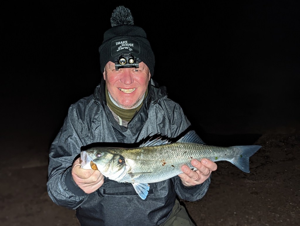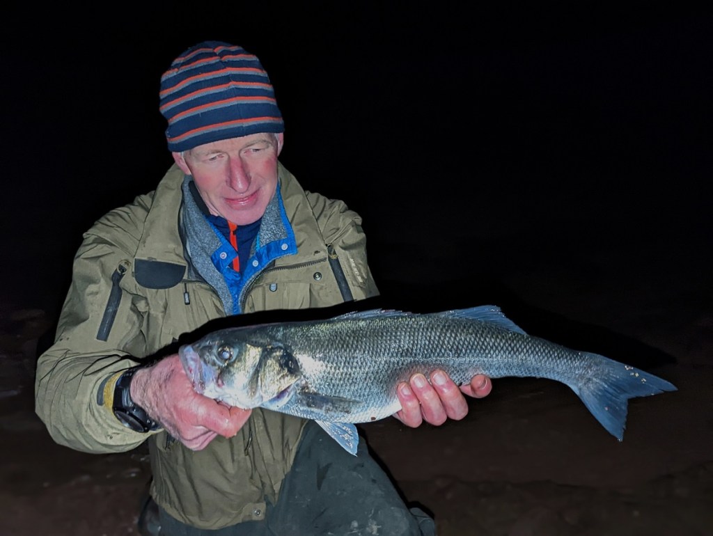 I’d said to David that a hit will just come out of nowhere, and most probably when I am stood next to him yapping the evening away about families, the news or more likely, all things bass… And then it happened, only moments after I’d left Keith and had wandered down the beach, net in hand in my expectant state, that as we began to chat his rod thumped over. The black Gravity Stick Pulse Tail had assisted me to place a 4lb winter lure-caught bass onto a clients line – what a great lure these things are.