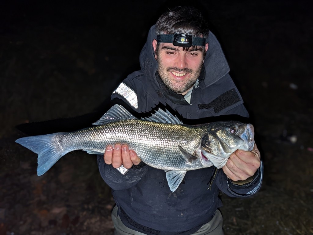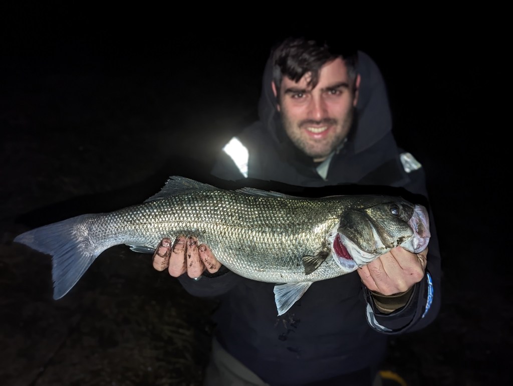 Honestly, the sight of the same bass effectively ‘mouthing’ the lure each time it was brought along a particular trajectory will remain in my head for a long time. “Go on, go on, go no” , ahhhhhh, go on, have a another cast into that area” On the third attempt she nailed it good and proper, and even though she swam through my legs as I attempted to net her, eventually we did it! David had landed his first ever bass on a lure from the shore (see below):