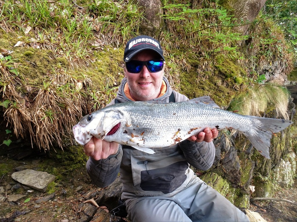 Pleasingly, I managed to land another bass of 55cm during this session, and followed it up with a slightly smaller one a few days later (see below) in some very turbid water following the heavy overnight rainfall – my tactics in this regard will form part of a chapter called ‘Overcoming Adversity’ within my next book, and describes how I have learnt to circumnavigate naturally occurring elements such as coloured water, weed fragments, very clear water, bright sunshine, etc. to name only a few scenarios that are thought to make it less than ideal to lure fish for bass.