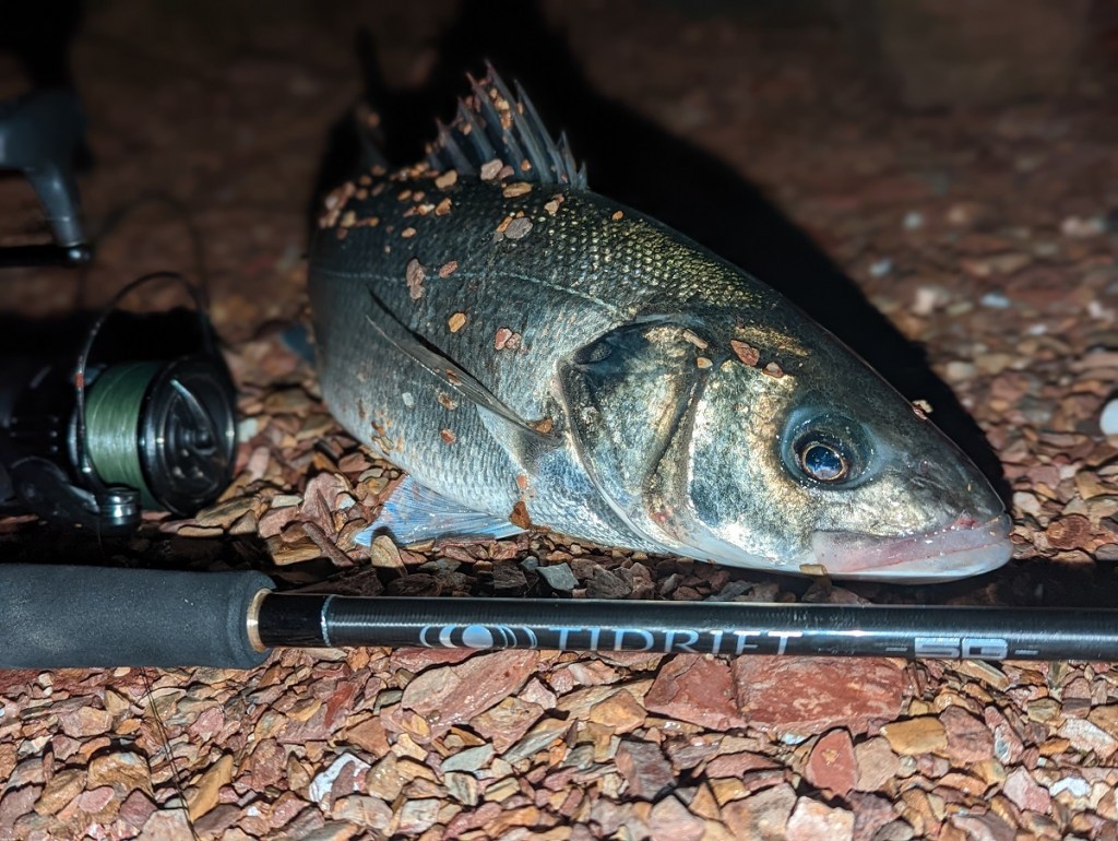 It isn’t always as easy as catching them the 3rd cast of course! However, as my mantra during the coldest months is to complete short sessions of no more than a couple of hours around what I consider to be the ‘best’ period in the tide, if the bass are feeding, I generally latch into one fairly quickly. As is very, very often the case when night fishing at this time of the year, as soon as I began to sense some additional tension through the rod and braid as the tide sped up, BANG!