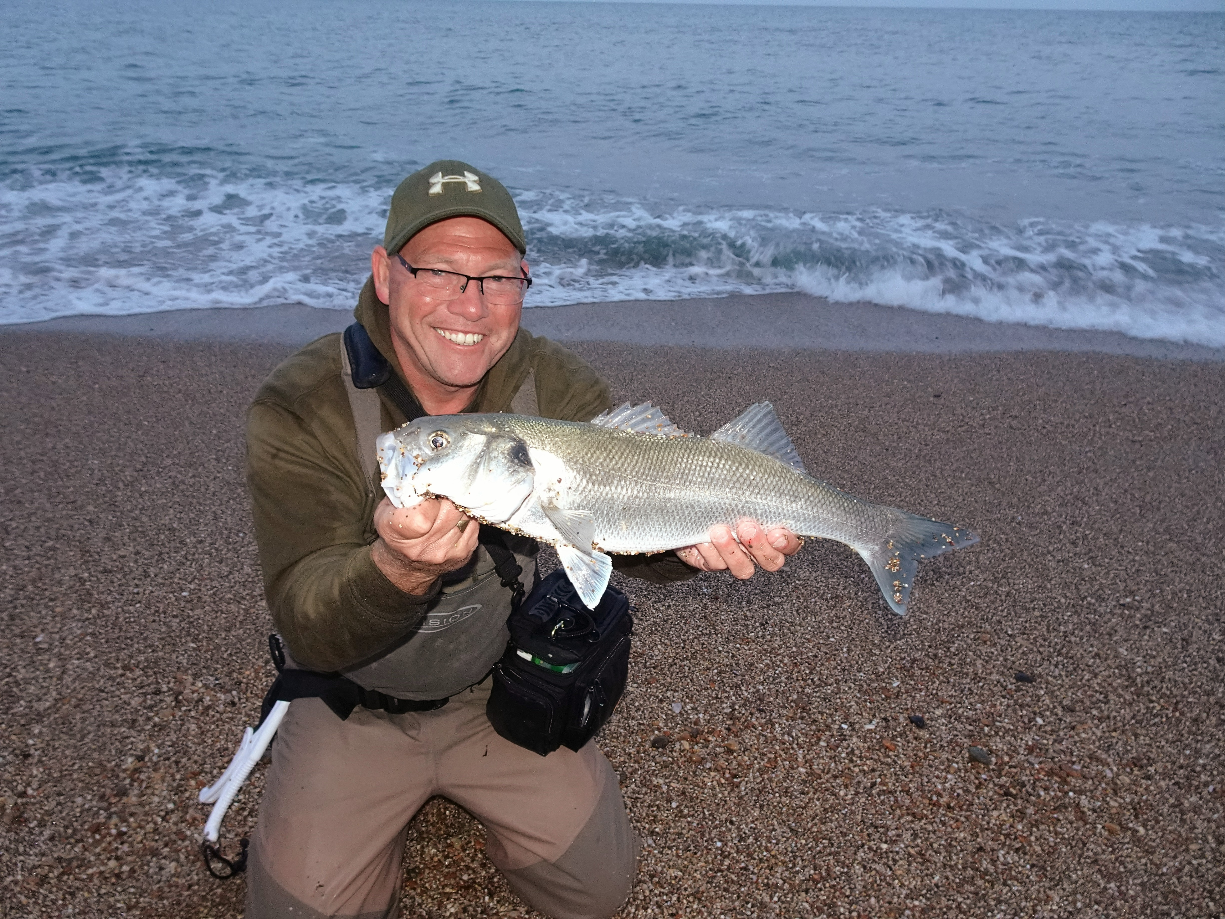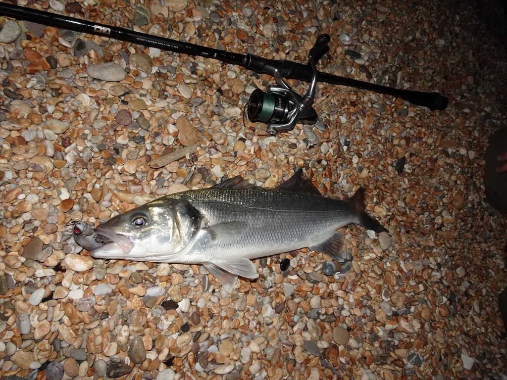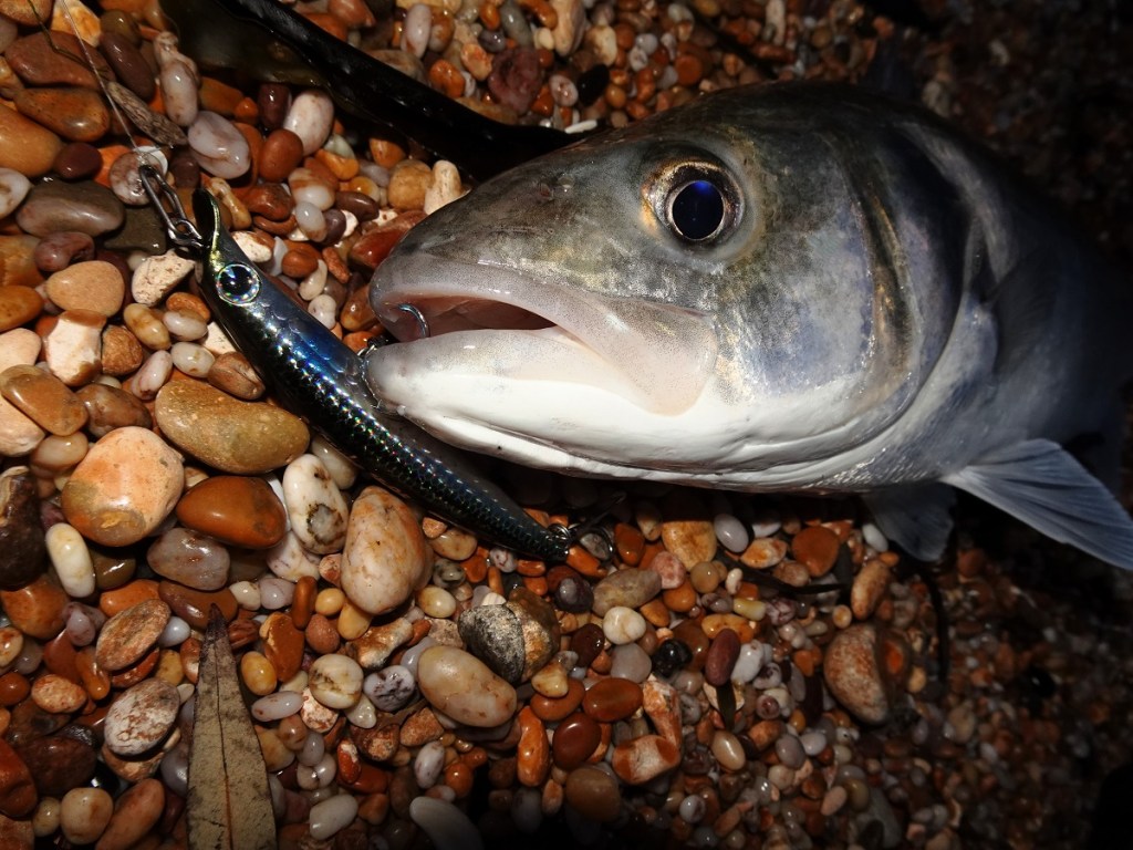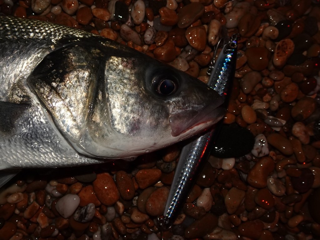 Yet, from those very steep shingle beaches, when and where the momentum and force of the wave is stunted by the angle of the shore, then, providing I/we remain high up the shoreline and remain vigilant (not easy in dark granted, but I’ll elaborate by saying that if you fish close to rocks you’ll still be able to ascertain/see when a larger series of waves move through and react accordingly) then, as you can see from the slideshows above and below, casting and retrieving a lure such as the IMA Hound Glide 100F or 125F in daylight and darkness can be absolutely lethal!