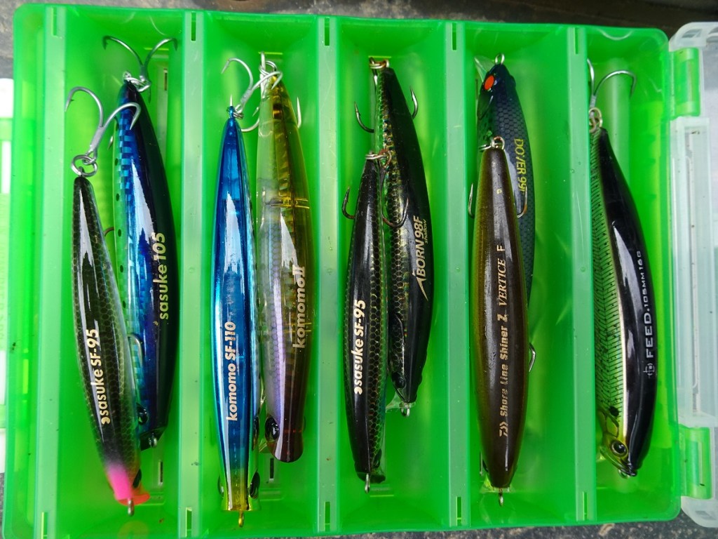 I enclose a photograph of my personal and current double-sided lure box in regard to this type of lure below. And as you’ll quickly be able to decipher, I do have a penchant for IMA and Daiwa hard plastics in particular, with patterns such as the APIA (Dover 99F), Megabass (Zonk 120F SW), Maria (Squash 95F), Longin (Hi-Standard 120F) and Tacklehouse (Feed Shallow 105F) also shoehorned in for good measure, and in case I require that ‘special lure’ for the situation or conditions… We’ve all got them haven’t we!