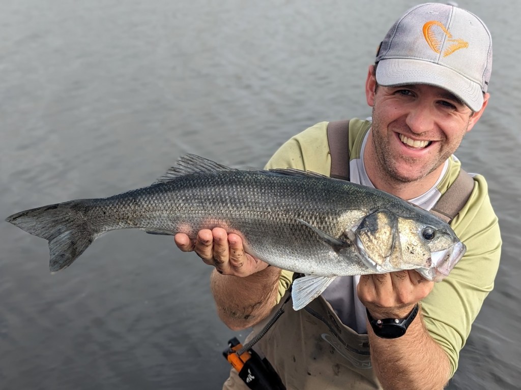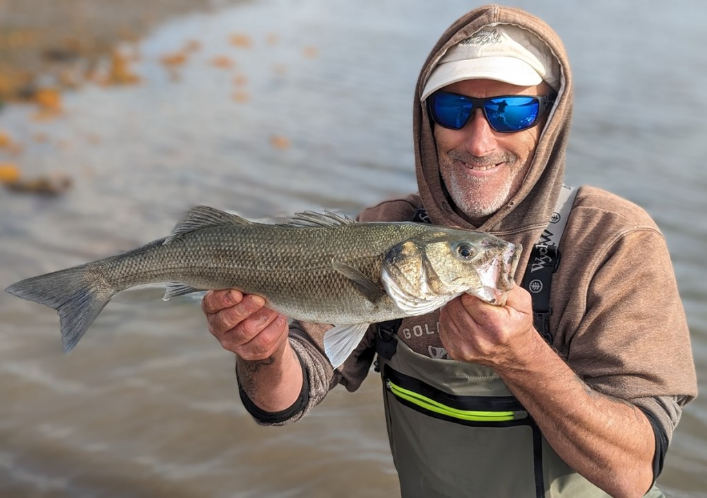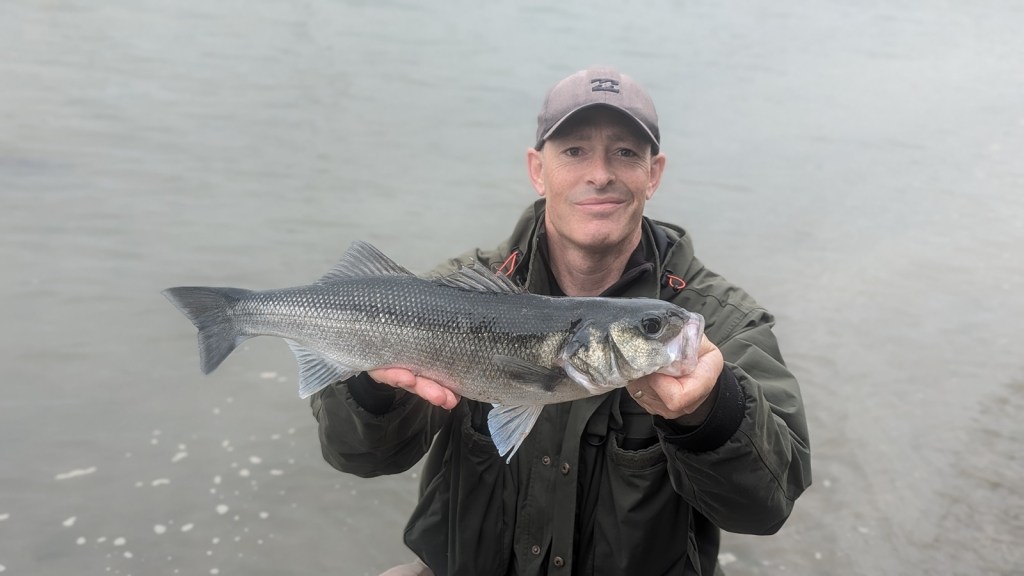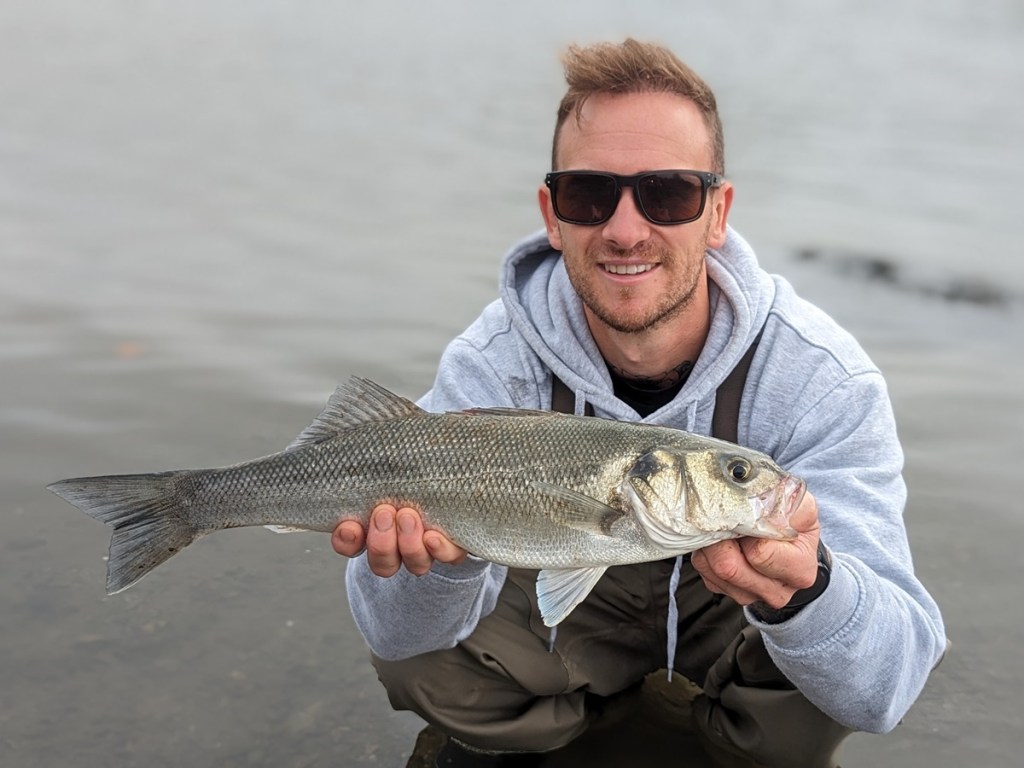 From the same Hi Viz pack (containing the vibrant Lemon Back pattern) his fellow client James (below) added a further quality bass as the water shallowed and the wind increased to produce the expected turbid sea conditions.