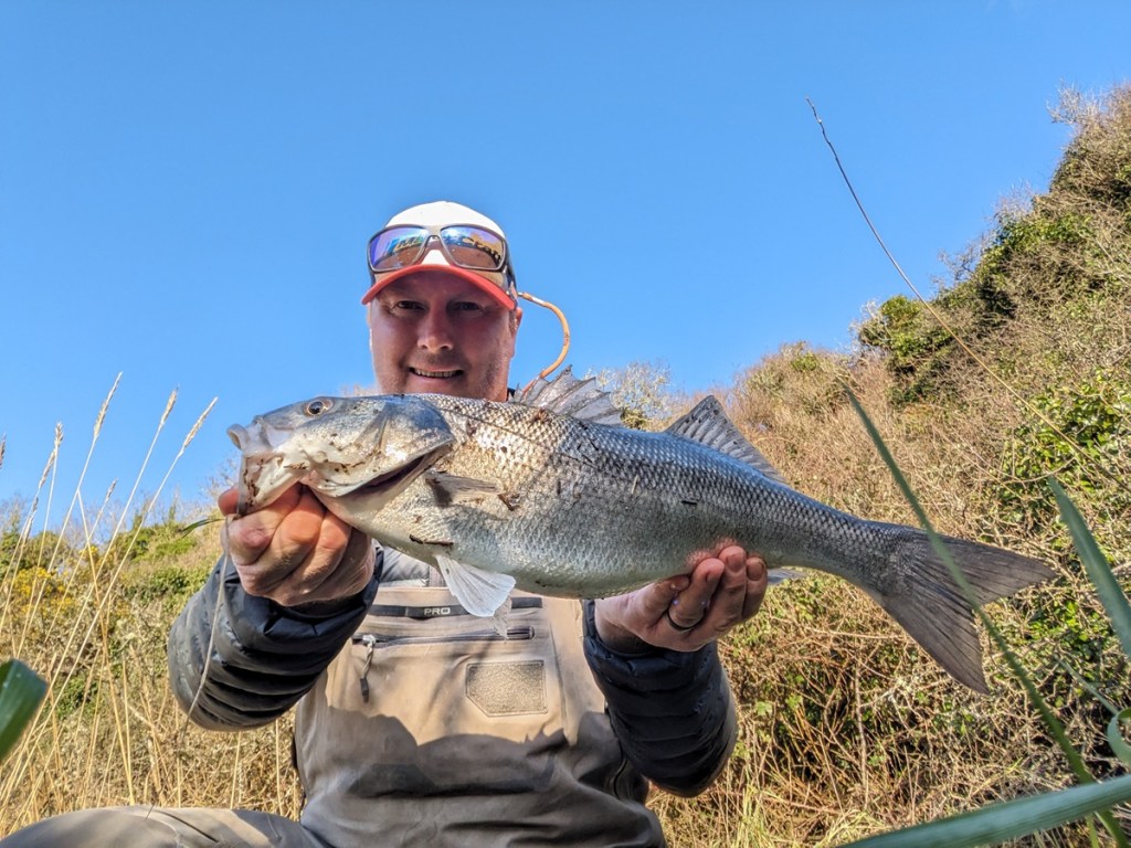 Admittedly, this a bass that has just been released and is recovering, but I have spotted them in water this shallow. What’s more, I recall one memorable occasion with a client, when we both witnessed a bass of a similar size to this 56cm fish actually swim on its side to exit a pool before it became marooned!
