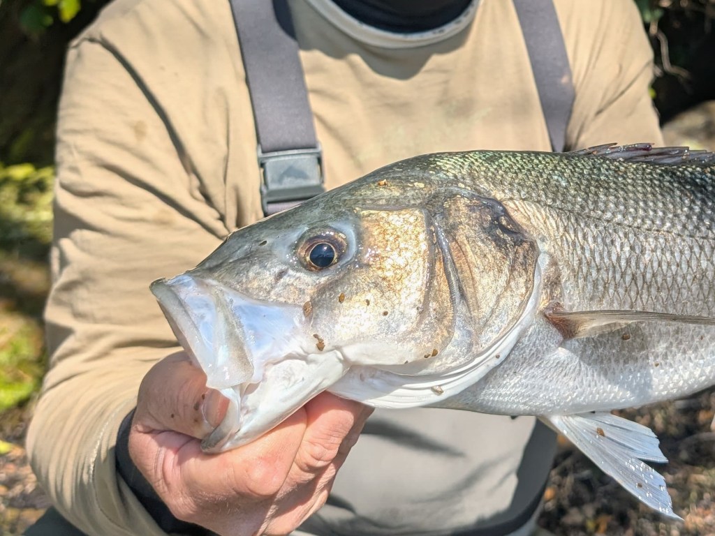 But the bass ‘need to feed’ is my/our attitude. So even though the plan was to shelter from the wind, it was actually a small section of shallow water that was being stirred up by it, and that my 2nd Guide Joe expertly exploited, that greatly assisted his client (Stephen) to hook the wonderful 60cm bass in the featured images: