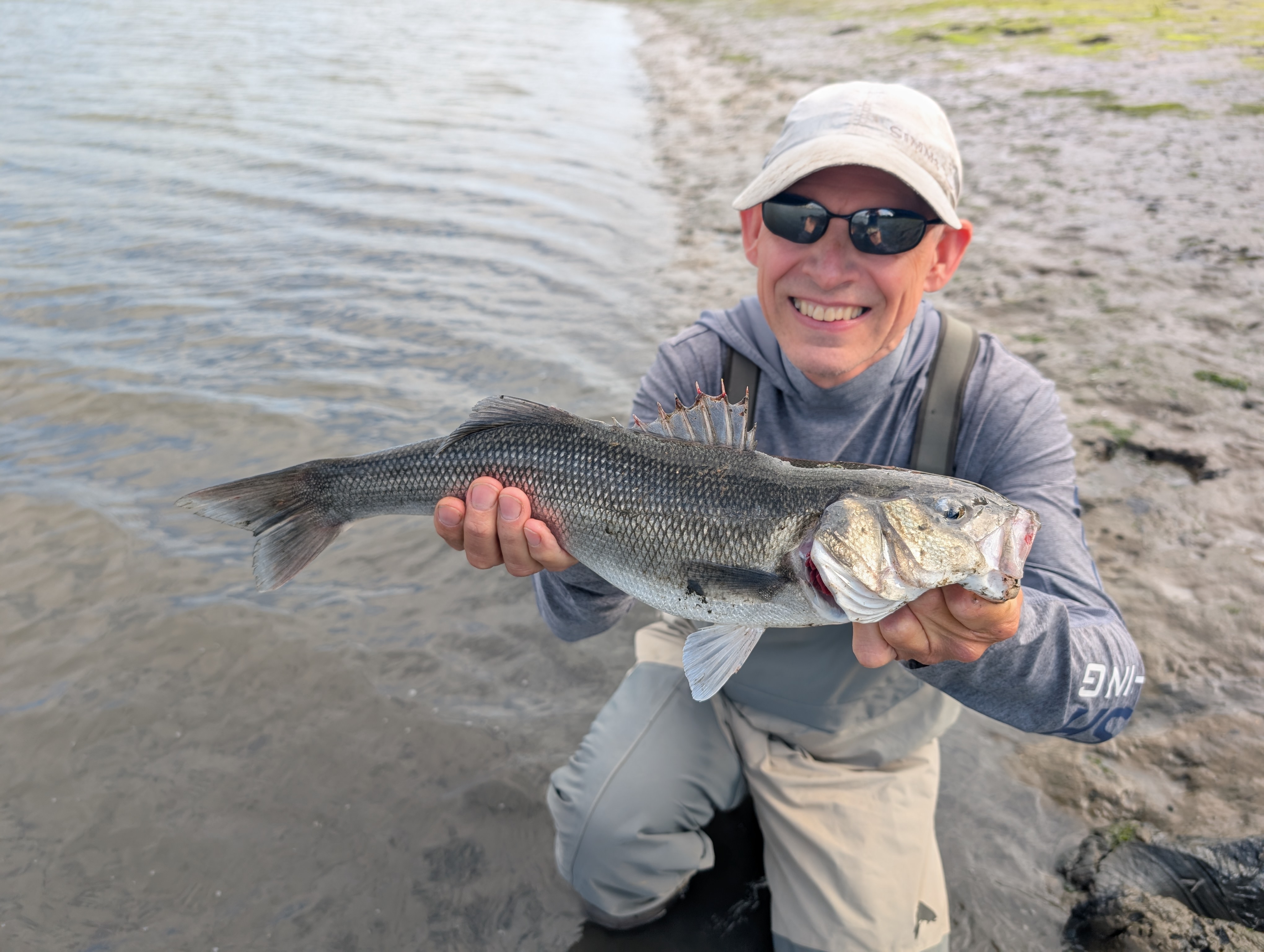 More tiddlers followed down to Low Water as the water level shallowed to only inches and the wind, as expected, momentarily calmed for a period of ten minutes or so. But when the tide turned, and the current began to visibly flow again I had a decision to make: go deeper with a soft plastic as mentioned above and risk it being covered with green salad (that you can see behind Mark’s head in the image above) every time it connected with the seafloor, or continue with the small surface lure ‘just to see’ what would happen…