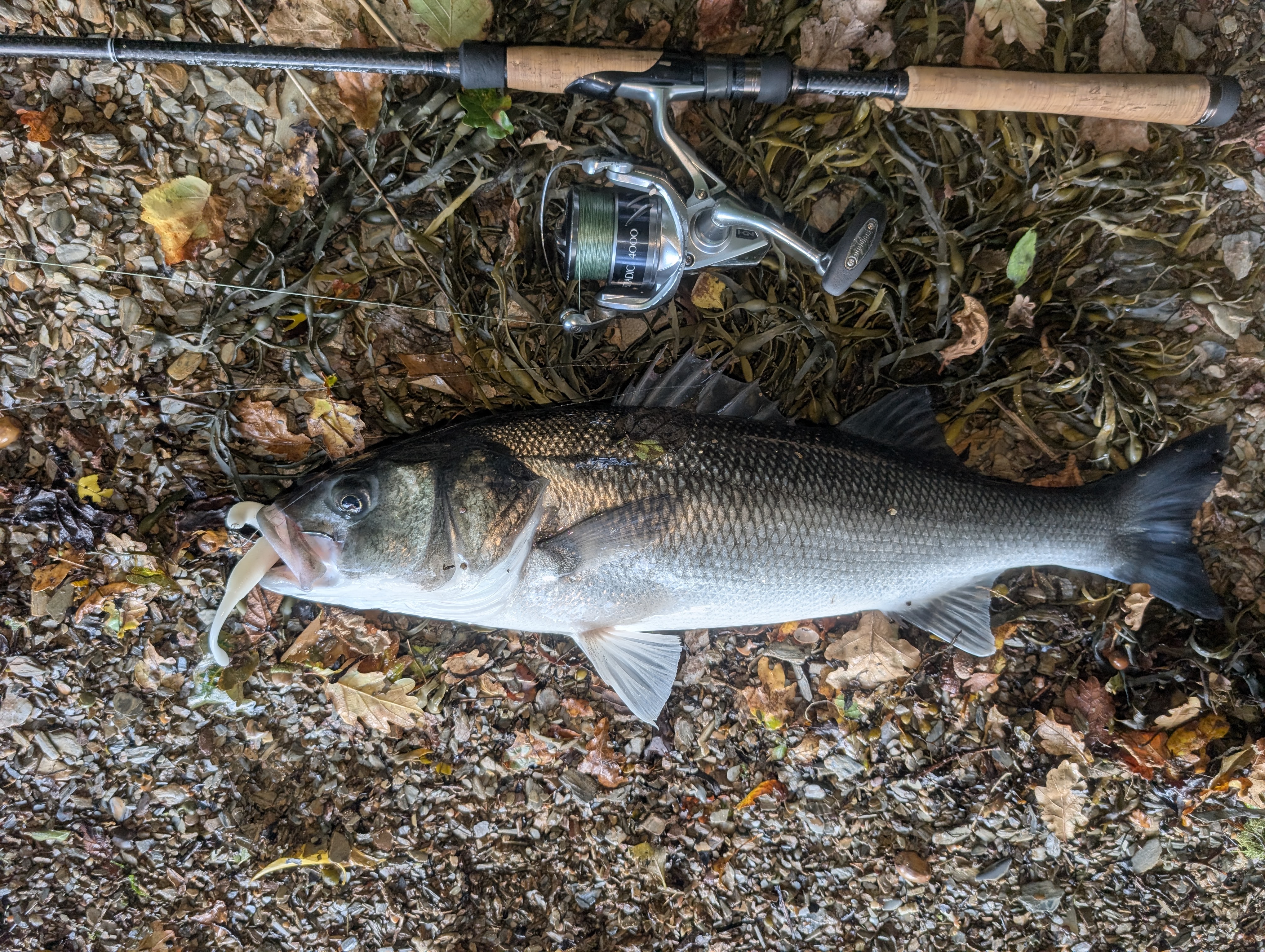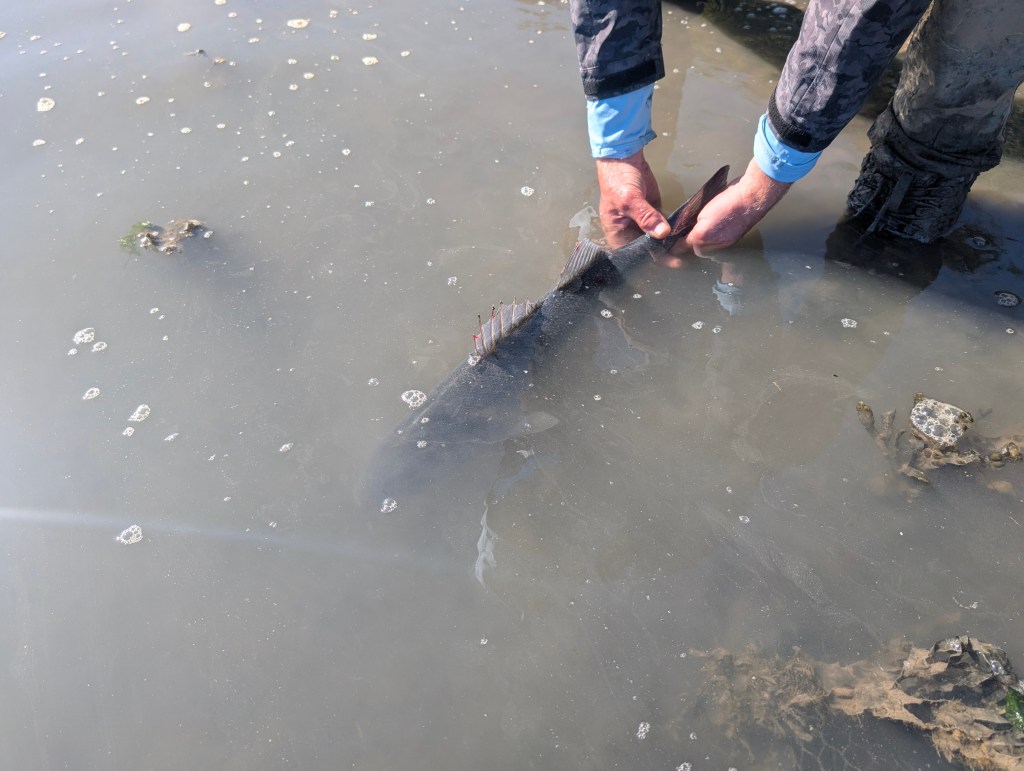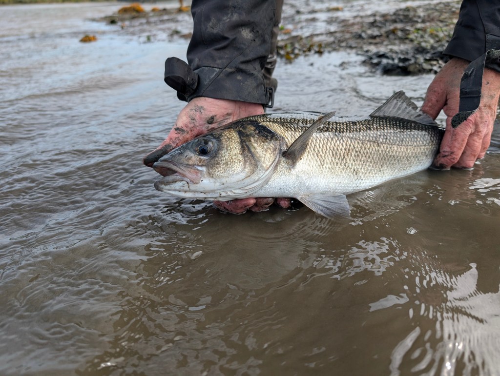 This 63cm bass swiped the DoLive Stick just off the rod tip, in what some fairly murky and fast flowing water following a switch from the Creature Bait Ian was initially using, but that was ‘tumbling’ along the seabed due the pace of the tide – a timely switch as it turned out!