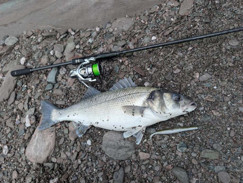 So with the amount of ‘salad’ and ‘suspending seaweed’ becoming more problematic as the water level deceased to cover a platform of sand, Joe and Maeve had to continually cast and move in order to find the gaps as it were. Further, with a weedless and now weightless Savage Gear Gravity Stick in a more natural colour attached, it was within a section between two rocky outcrops fuether along the shoreline that Joe REALLY had his ‘Bass Eye’ fixed…
